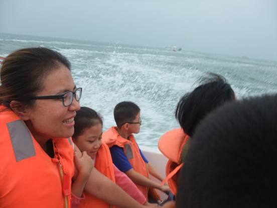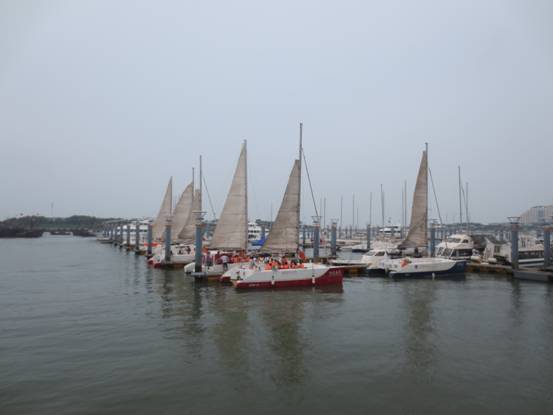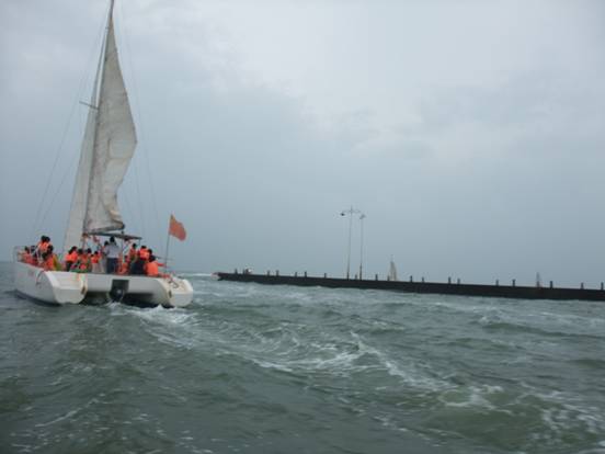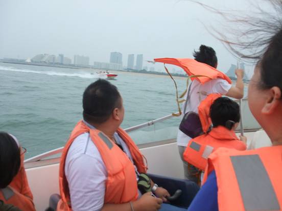 中午12:00多到達(dá)了日照,見(jiàn)到了黑黑圓臉導(dǎo)游小劉,小劉安排大家快速用完午餐來(lái)到了日照萬(wàn)平口景區(qū)。在黑黑小劉的一直強(qiáng)說(shuō)之下,家人乘坐上了游艇、帆船。感受了奧帆基地的風(fēng)采與刺激,感受到大海寬廣的胸懷與氣魄。